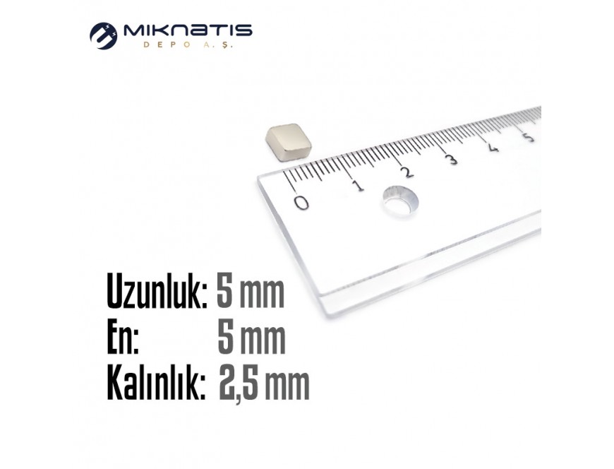 Boy: 5mm - En: 5mm - Kalınlık: 2.5mm Neodyum Mıknatıs