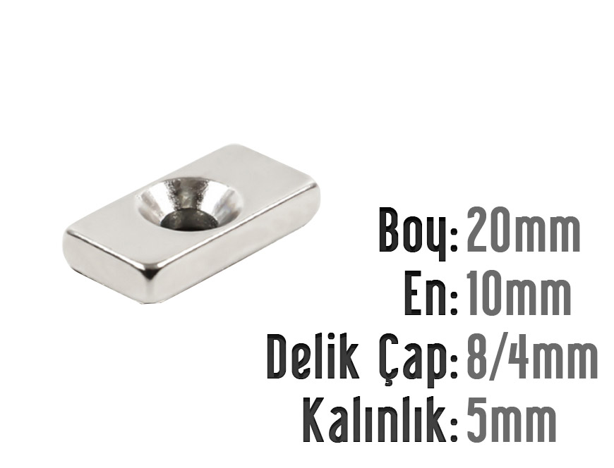 Boy: 20mm - En: 10mm - Delik Çap 8/4 Kalınlık: 5mm Havşalı Mıknatıs